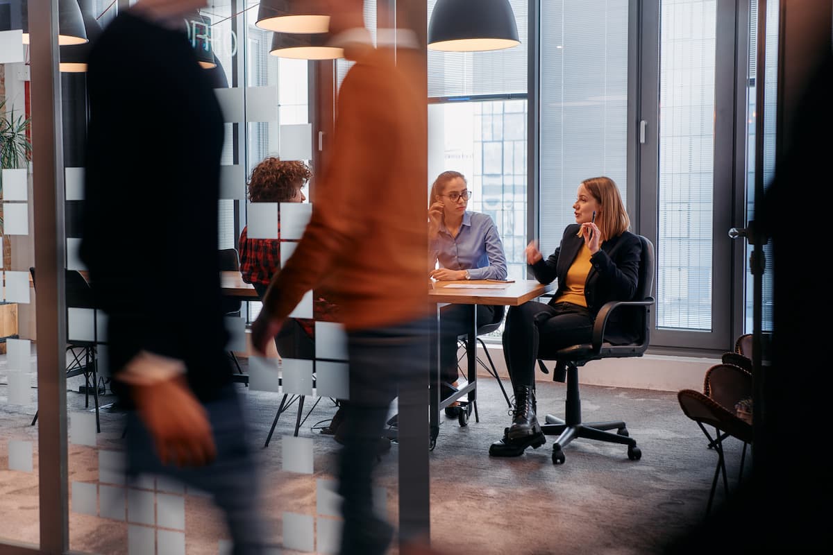 A senior sales team manager conducts a strategy session at a table in a modern building